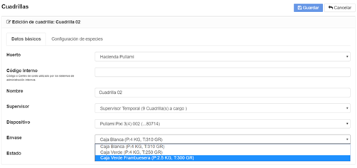 3.- En el formulario de Edición seleccionar el envase de cosecha correspondiente y presionar el botón Guardar