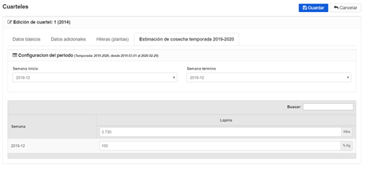 Se debe cargar esta información por cuartel. Esta sección servirá para visualizar en el dashboard o panel de inicio el estado de avance en la producción v/s lo estimado como objetivo productivo del huerto.