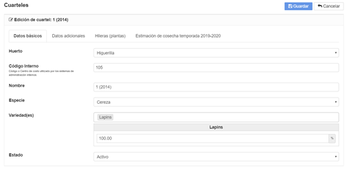 - Estado: seleccione el estado Activo o Inactivo. La opción inactivar se utiliza cuando un huerto ya no existe o está fuera de labor