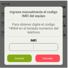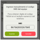 Actualización de Android: al iniciar la aplicación aparecerá una ventana que solicita ingresar el código IMEI. La activación de este procedimiento es OBLIGATORIO.
